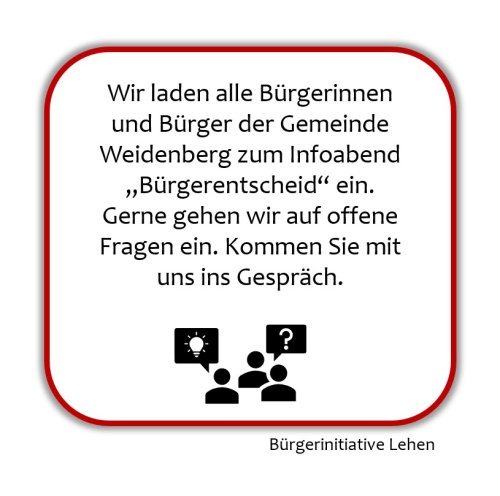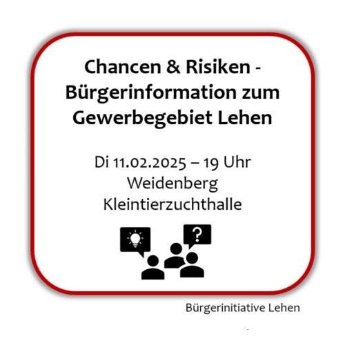 Die Bürgerinitiative Lehen lädt alle interessierten Bürgerinnen und Bürger der Gemeinde Weidenberg zu einer Informationsveranstaltung ein, um über die geplante Entwicklung des Gewerbegebiets Lehen zu sprechen. Im Rahmen eines Bürgerentscheids sollen die Chancen und Risiken dieses Vorhabens beleuchtet werden.